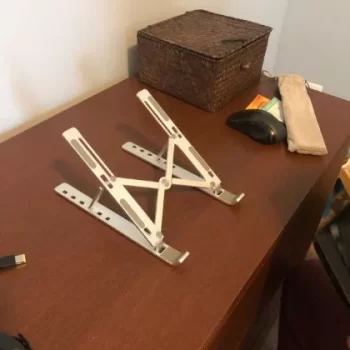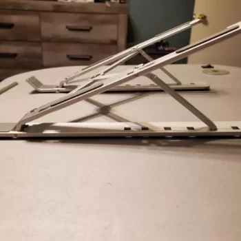 I wish I purchased this much sooner. My neck and headaches have stopped as soon as I put this up. Holds up pretty good as I have 2 kittens that just have to behind my laptop and play while I’m working. Some how it still stands and my laptop hasn’t moved. Don’t take me wrong they did hit one of the legs yesterday and it all came down. Kittens are getting bigger