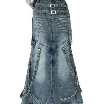Chic Y2K Gothic Mermaid Denim Skirt with Belt – Casual Empire Waist Maxi