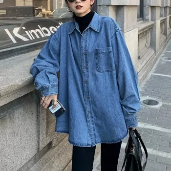 Chic Dark Blue Denim Shirt for Women – Spring Full Sleeve Loose Retro Jacket