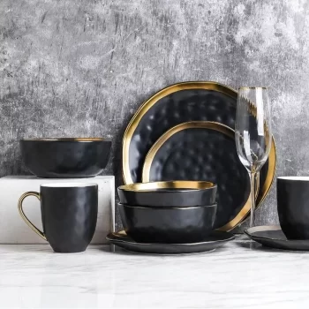 Elegant 16-Piece Gold-Rimmed Black Porcelain Dinnerware Set