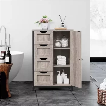 Elegant Gray Wooden Bathroom Storage Cabinet with 4 Drawers and Adjustable Shelves