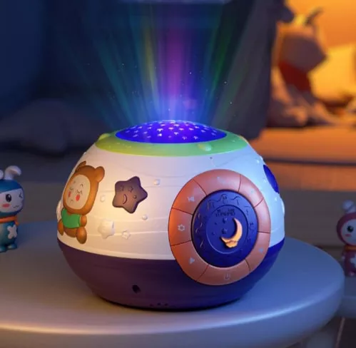This is an uncomplicated night light projector that does as advertised. There are several options of color combinations and it's fun for toddlers to explore them. I do wish the dome had been made of a sturdier plastic as my toddler crinkled it immediately (but thankfully, it can be fixed and does return to its shape).